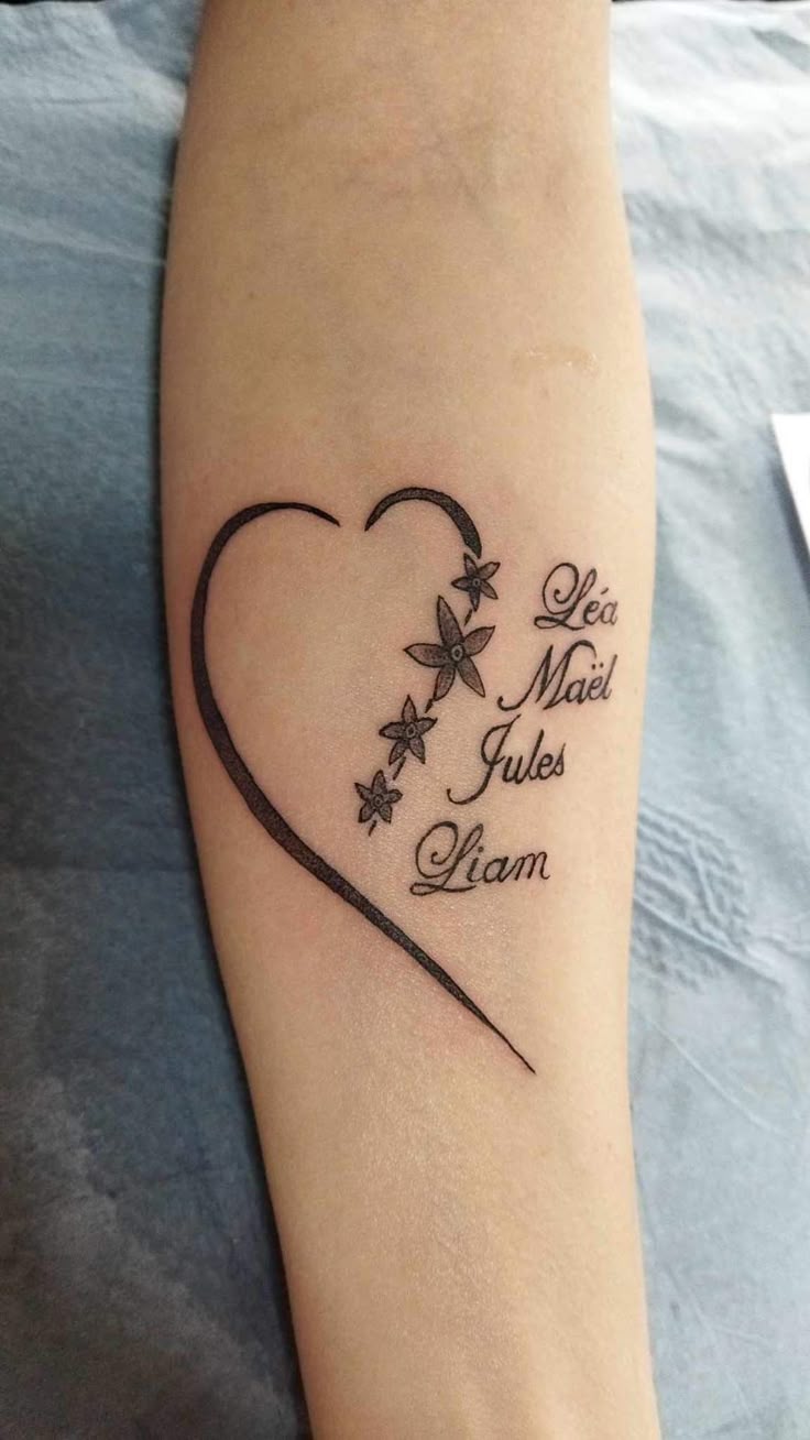 This tattoo features a simple, elegant design with four children’s names “Léa”, “Maël”, “Jules” and “Liam” along a heart-shaped outline with tiny floral embellishments. The natural themes along with the family elements have created a poetic visual effect in this design. Its black ink along with minimal lines offers moms a deep tattoo that suits those who like clean and deep minimalist designs.