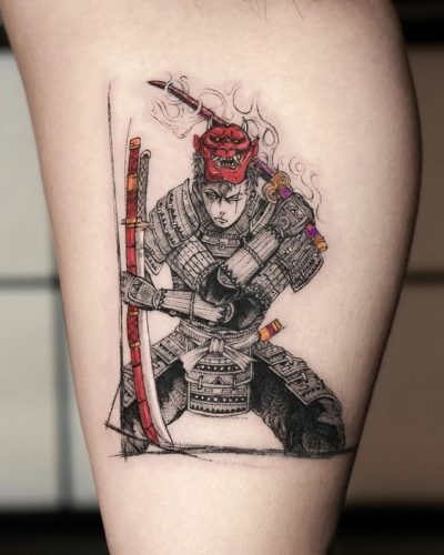 Venturing into a more contemporary realm, this thigh tattoo integrates traditional samurai imagery with abstract design elements. The warrior figure is enveloped in splashes of red and black ink that seem to move fluidly around the solid, detailed form of the samurai, creating a visual spectacle that is both modern and timeless.