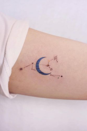 Here we see a delicate portrayal of Leo with a crescent moon included in the constellation, offering a nod to the cosmic dance between celestial bodies. The tattoo’s placement near the collarbone adds a touch of sensuality and mystery, making it an exquisite pick for women drawn to fine line designs that tell a story.